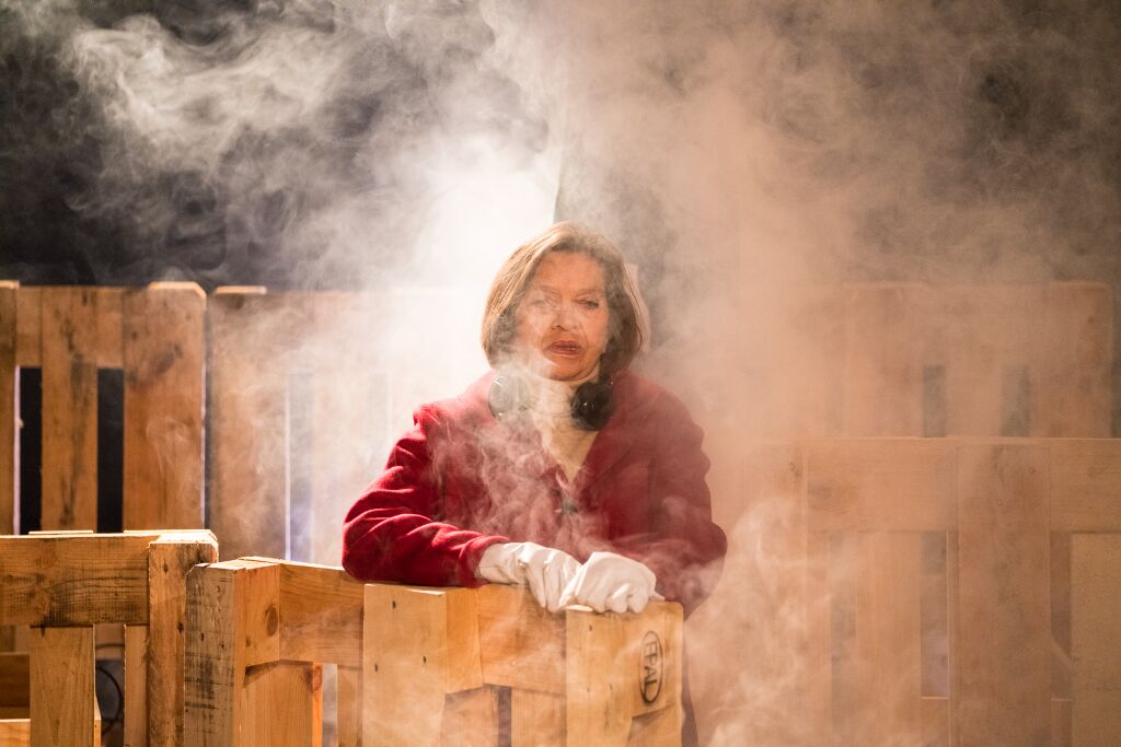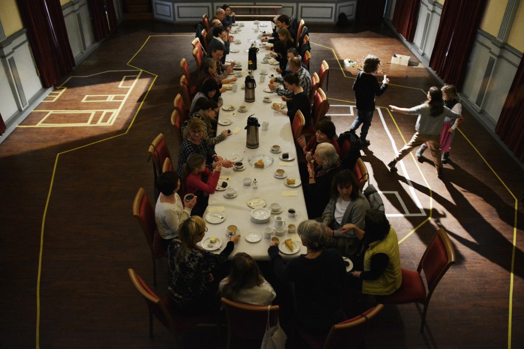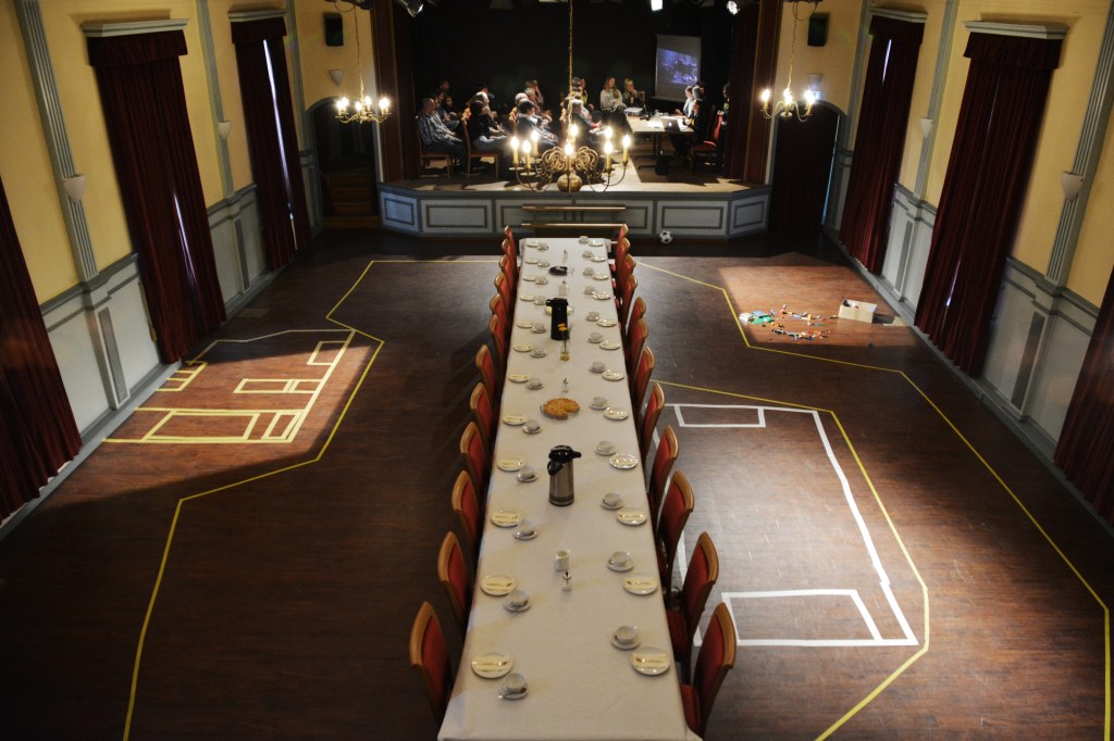 Das Publikum ist eingeladen zu einem theatralen Frühstücksbuffet, um auf der Bühne den Blick auf das zu lenken, was uns täglich erreicht: auf die Wörter und Bilder über den Krieg.